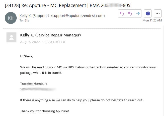 I reported what I thought was a software issue in an Aputure light I purchased from Amazon almost 2 years ago.