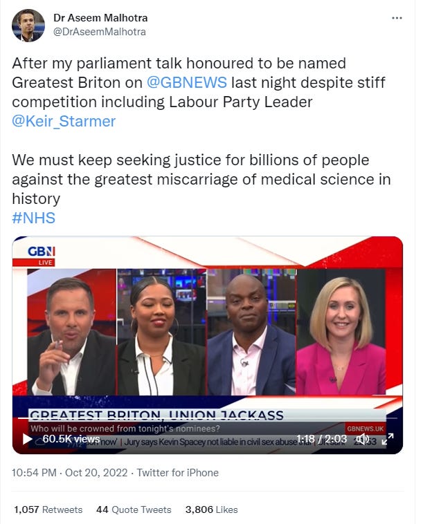 First, Dr. Aseem Malhotra testified in Parliament about the dangers of the COVID vaccine on October 20. There is no press coverage. I couldn’t find any references to his speech in searching Google. I even had a hard time finding anything on Twitter!