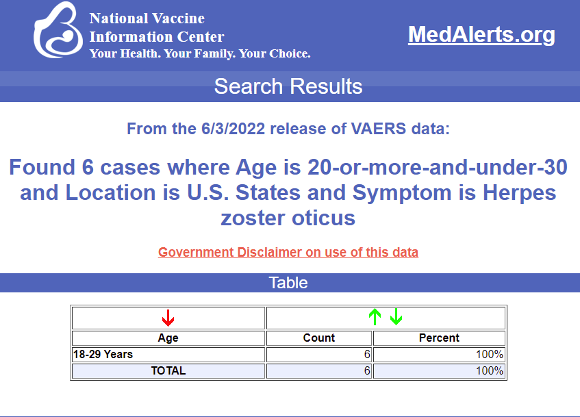 As all misinformation spreaders know, the MedDRA search term to use for RHS is the more cool-sounding “Herpes zoster oticus.”