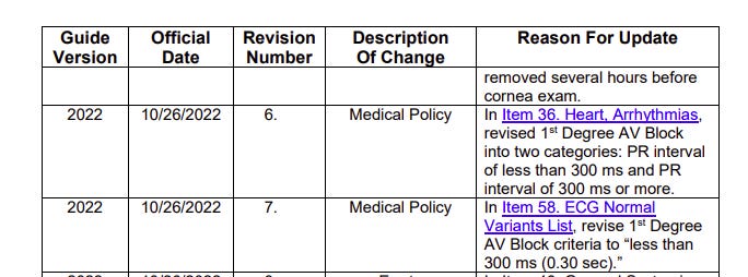 In the October 2022 version of the FAA Guide for Aviation Medical Examiners, the FAA quietly widened the EKG parameters beyond the normal range (from a PR max of .2 to unlimited). And they didn’t widen the range by a little. They widened it by a lot. It was done after the vaccine rollout.