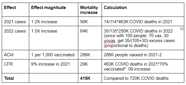 There were just over 1M excess deaths in (2021+2022) vs. 2019 baseline. My vaccine related deaths (415K) are well within this number. This means the vaccines killed nearly as many people as COVID during the period (720K).