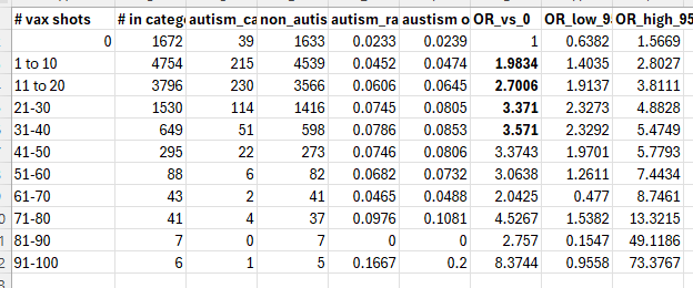 I was able to confirm the high odds ratios when kids are given large numbers of vaccines in a survey I did of over 12,000 parents on May 19, 2023. The high OR values are consistent with the peer-reviewed literature. It took me a couple of hours to do the survey. Anyone can replicate my work. Nobody will.
