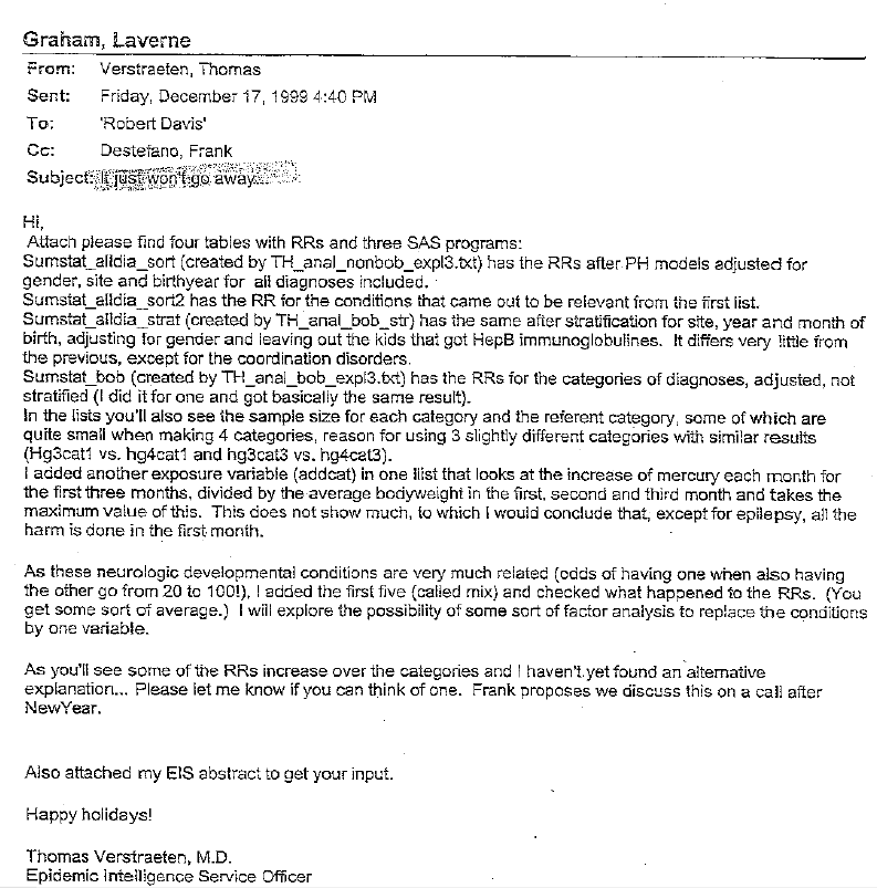 Verstraeten tried for 4 years to make the signal go away and largely succeeded. He penned a famous email in 1999 with the Subject line “It just won’t go away” reproduced below