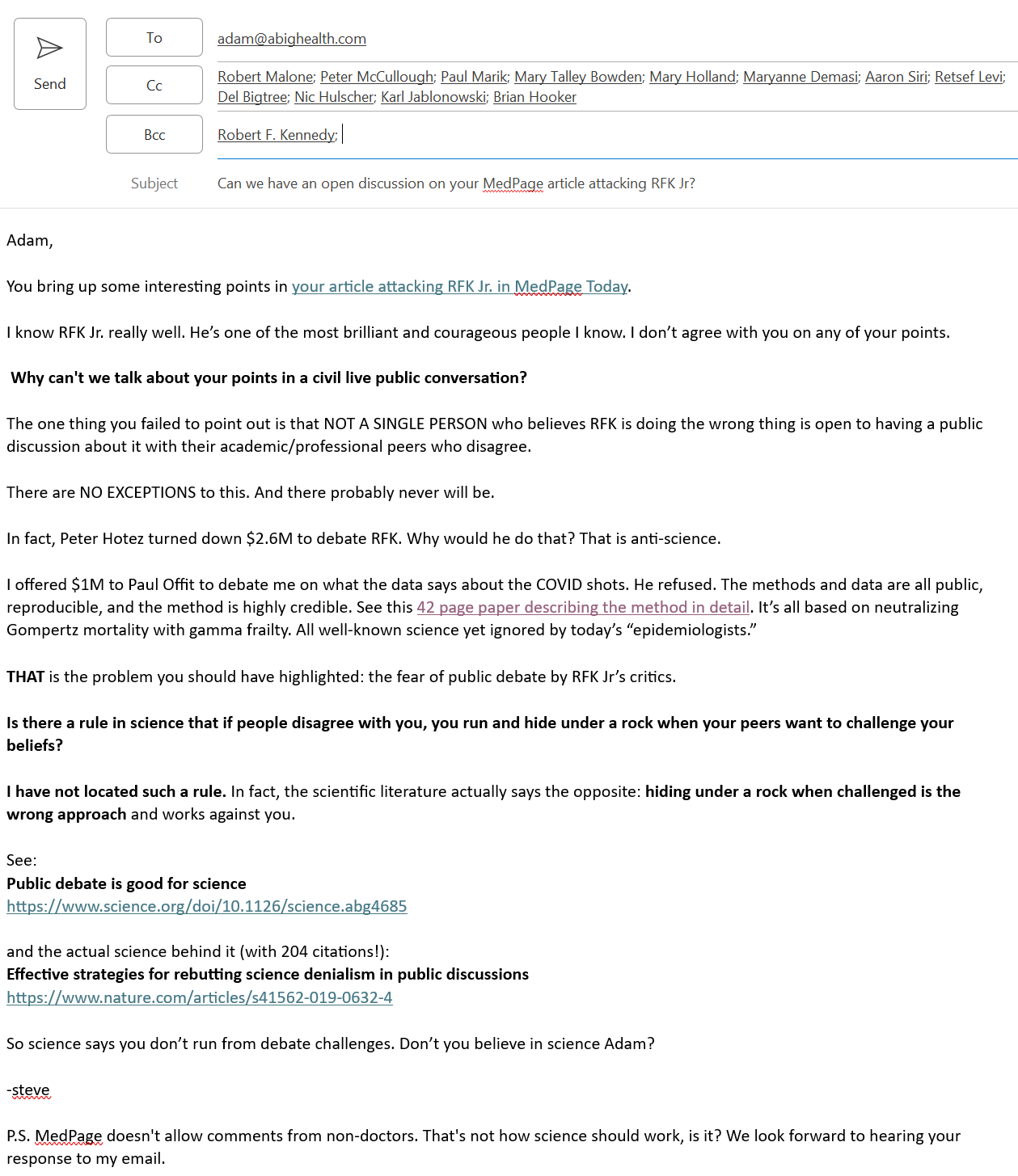 my email to Dr. Brown pointing out that RFK Jr isn’t the problem; it’s that people like him refuse to engage in public discourse with qualified peers who have different views