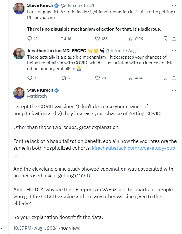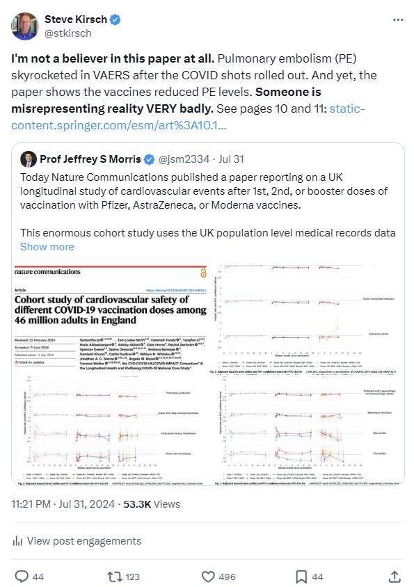 And we have other supporting data as well: nearly all the PE reports in VAERS are associated with the COVID vaccine and there are over 15,000 reports. Since VAERS is at least 50X under-reported, this suggests around 650,000 PE’s associated with the COVID vaccine. That’s a train wreck. In addition, I did a survey of my followers on X, 80% of whom did not take the COVID vaccine, and the results were consistent with the safety signal in VAERS: 85% of all the PE cases people observed after 2021 were associated with the COVID vaccine.