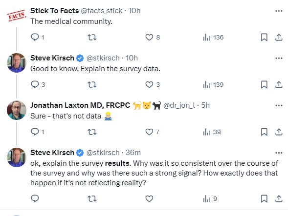“Stick to Facts” said I should believe the medical community. I asked why and was told that I shouldn’t believe anything that people see with their own eyes as that is not “data” in their opinion. Apparently, because the respondents to my survey are not trained medical experts, their observations should be completely ignored and don’t have to be explained. That’s nice, but it simply doesn’t explain why I should also ignore the professional observations of top doctors such as Peter McCullough, Aseem Malhotra, Paul Marik, Pierre Kory, Ryan Cole, and others who all are saying the same thing as the X surveys said.