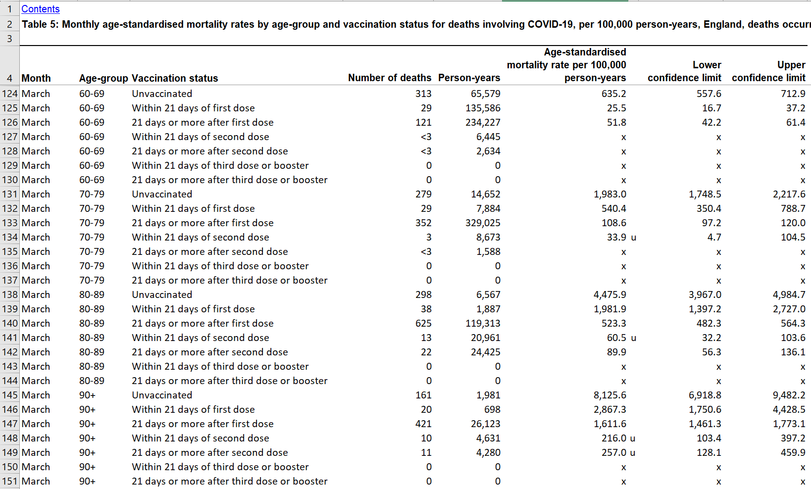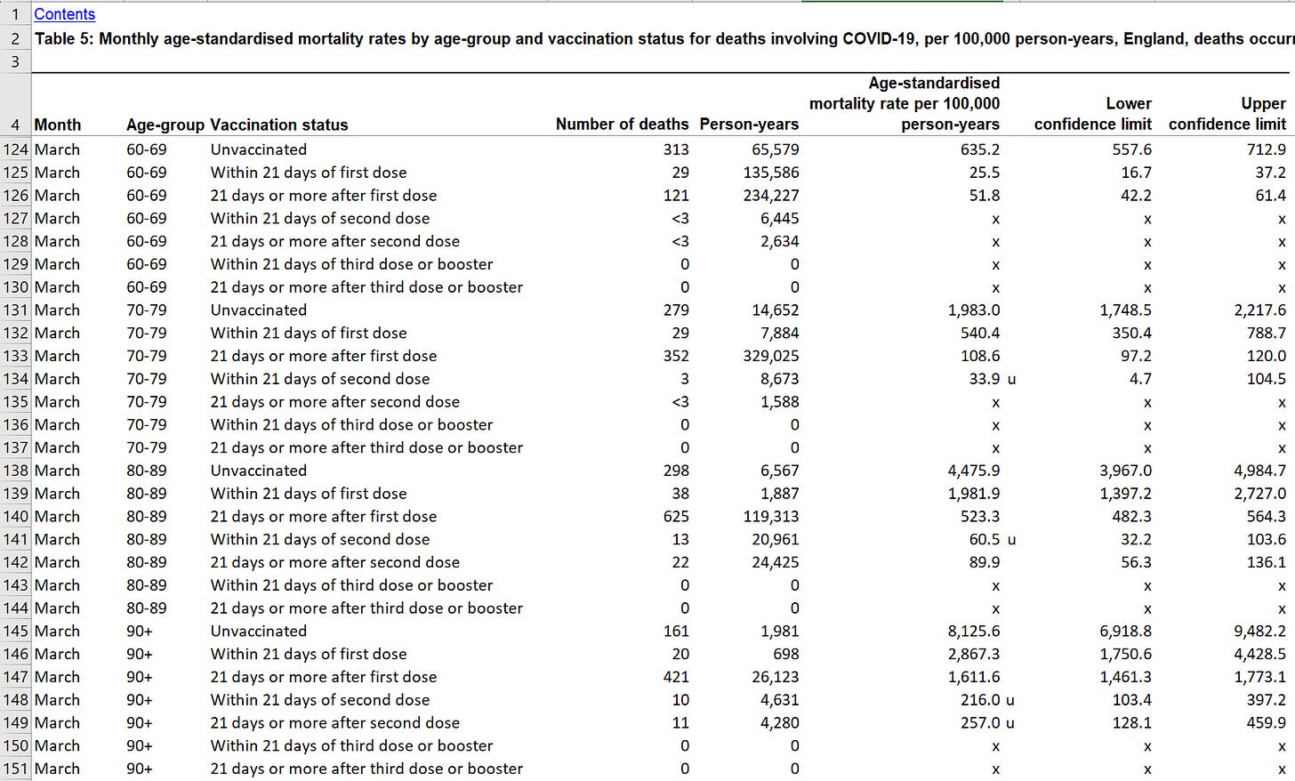 Note that the UK data also claims that the vaccine “works” very rapidly, certainly within 21 days of the first dose. Download the UK ONS data here. Here’s a snippet showing HUGE reductions in COVID mortality just 21 days after the first shot. For example, a 60 year old goes from an ASMR for COVID of 635 per 100K person-years to just 25.5, which is a reduction of 25X (but they are 95% confident it’s at least a 15X reduction (557/37). That’s just after the first dose. Can you imagine what the reduction after the second dose must be! It’s so high they can’t even measure it!!! So we should be seeing HUGE IFR reductions in the data 30 days after 50% of the population is fully vaccinated, right?. But as I noted above, the IFR increased from .17 (baseline) to .22 (March 7, 2021), which is a 29% increase. That is a HUGE HUGE problem.
