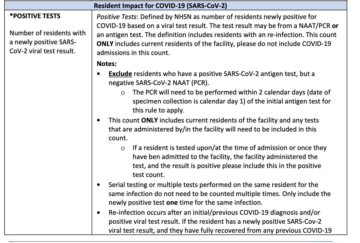 Nor did the reporting instructions (the Interim Final Rule Updating Requirements for Notification of Confirmed and Suspected COVID-19 Cases Among Residents and Staff in Nursing Homes) mention that nursing homes should not count such cases.