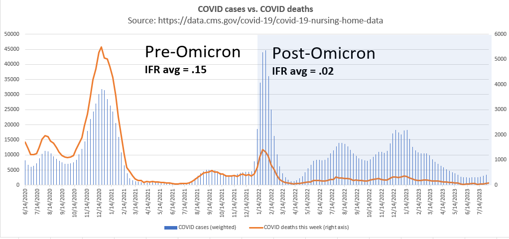 The IFR should have dropped like a rock after the vaccines rolled out. But instead the odds of death increased by 6%. Furthermore, the odds of death did drop like a rock later, right when Omicron rolled out; exactly as predicted.
