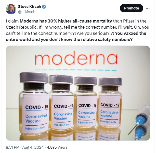 The Czech Republic data where we found that Moderna increases all-cause mortality by 30%. If that’s wrong, what’s the right number and how come nobody knows what it is?