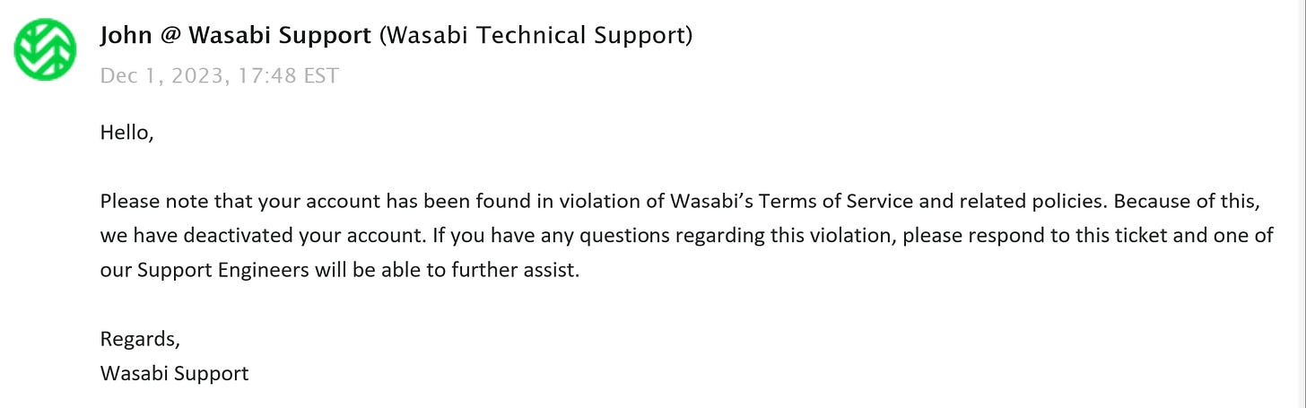 Wasabi turned off my account without notice and won't reactivate it; I have a new bulletproof provider