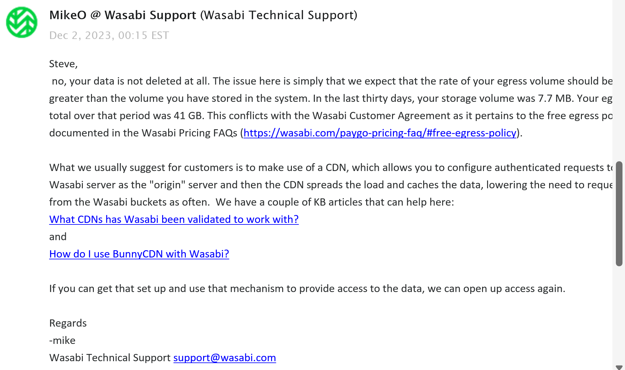 Email to the CEO of Wasabi about my urgent situation was not returned.