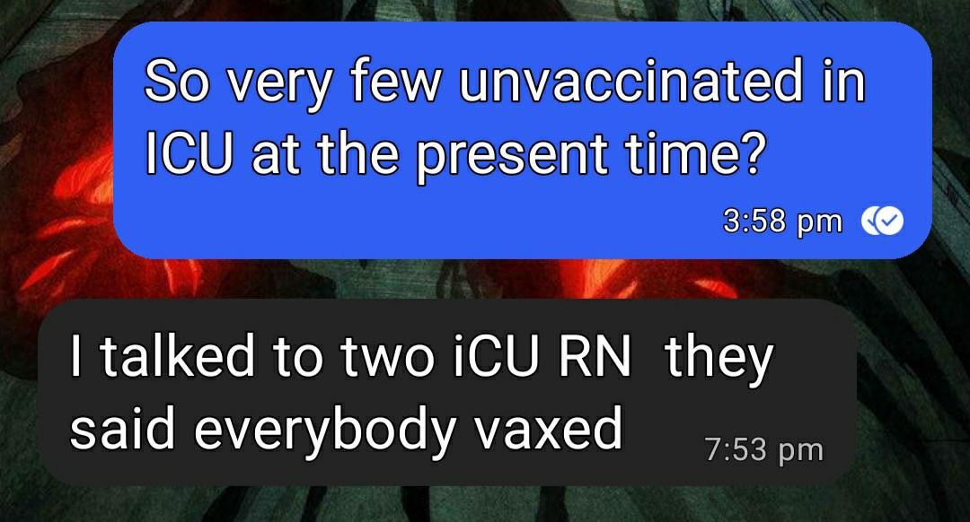 I got this info from a very large hospital near where I live. If this is a pandemic of the unvaccinated, then why is EVERYONE in the ICU vaccinated?