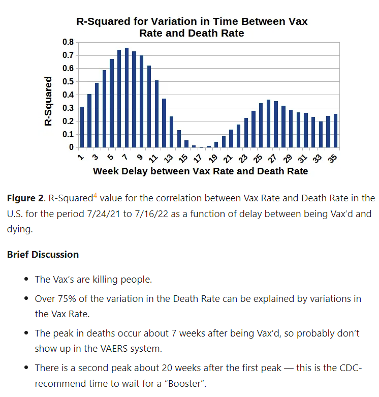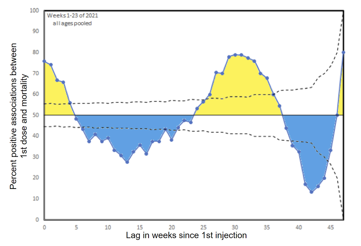 What he found was that the number of COVID vaccine injections can explain a third of the non-COVID excess deaths 23 weeks later. That’s huge. That is causality. The p-value is p<.001.