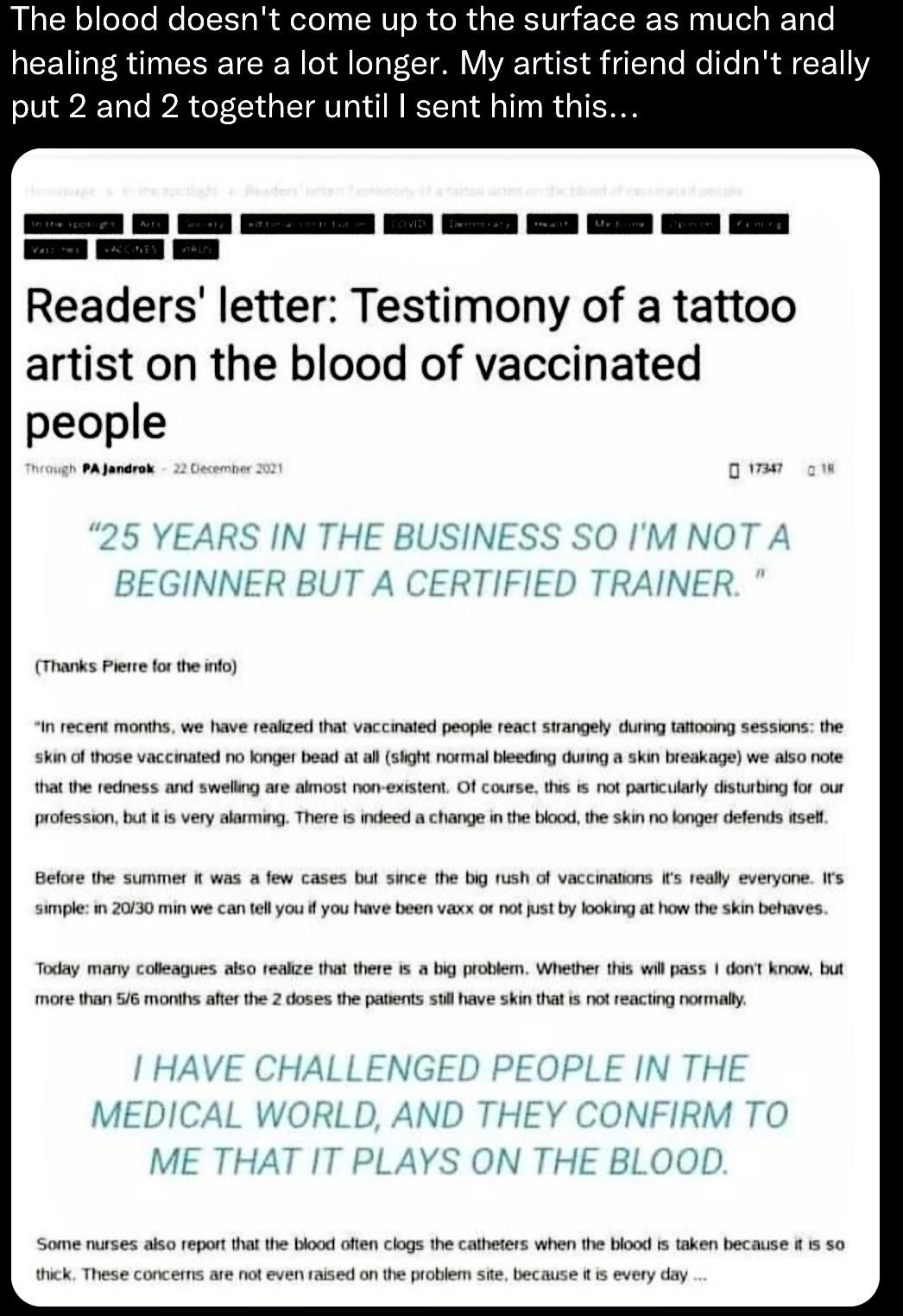 The blood doesn’t return to normal for more than 6 months after vaccination. In just 20 minutes, a good tattoo artist can tell who is vaccinated and who isn’t. I tried reaching out to tattoo artists myself to verify this and they just hung up the phone when I asked about this. I wonder why?