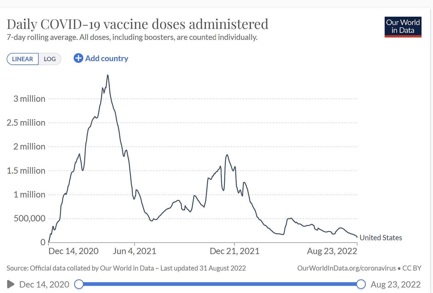 One possible interpretation: the first peak is due to the first two doses and the second peak is due to getting the next booster. Food for thought. This may make some sense since the booster peak is lower (fewer people get the booster). Or it may just be that the vaccine has two time constants of harm. Or it could be a combination of both!