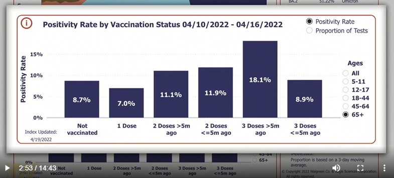 It’s also important to note it isn’t just the UK numbers that are troubling. The numbers from Walgreens in the US aren’t supportive either, not even for the elderly which is the most vulnerable group. It shows that the third dose wears off and leaves you much worse off than the unvaccinated (more than twice as likely to be infected).