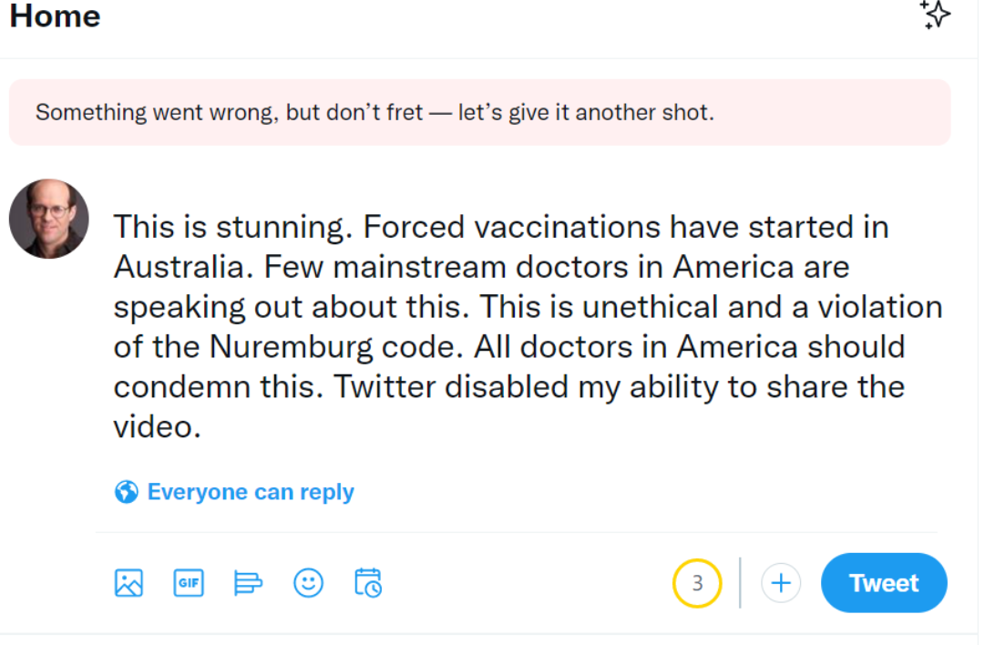Here was my last action when I was notified of the suspension. I wanted to let people know about the human rights abuse in Australia. The tweet never got sent. Twitter was just not letting me share this stunning abuse of human rights (the video was of Australians protesting that they are being physically forced to take the vaccine).
