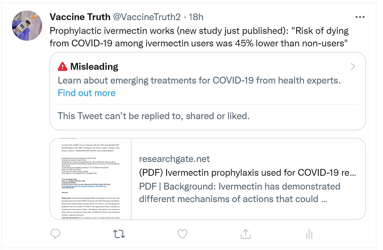 Not sure if anyone has mentioned earlier that Ivermectin is out of patent. Big pharma cannot make big bucks from sales. Full stop.