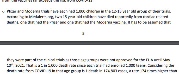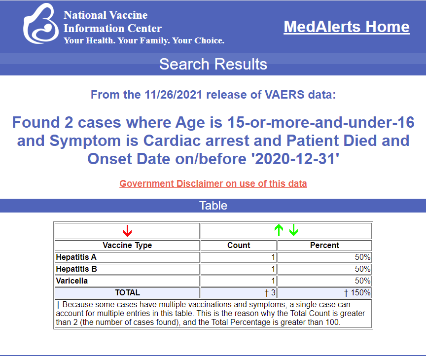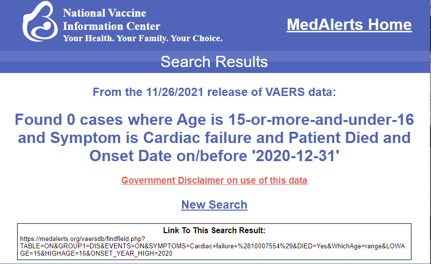 Just the two deaths in VAERS of 15-year-olds who were illegally vaccinated (meaning out of a very small number of illegally vaccinated kids) should be frightening to any parent. The fact that they both died within days of the vaccine and both died from cardiac issues, is troubling. It should be yet another reason for calling for an immediate halt to these vaccines and mandates.