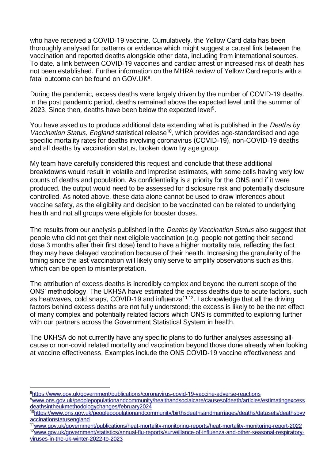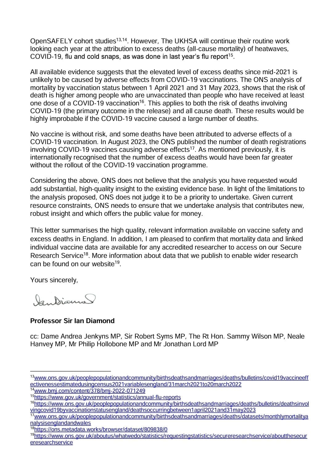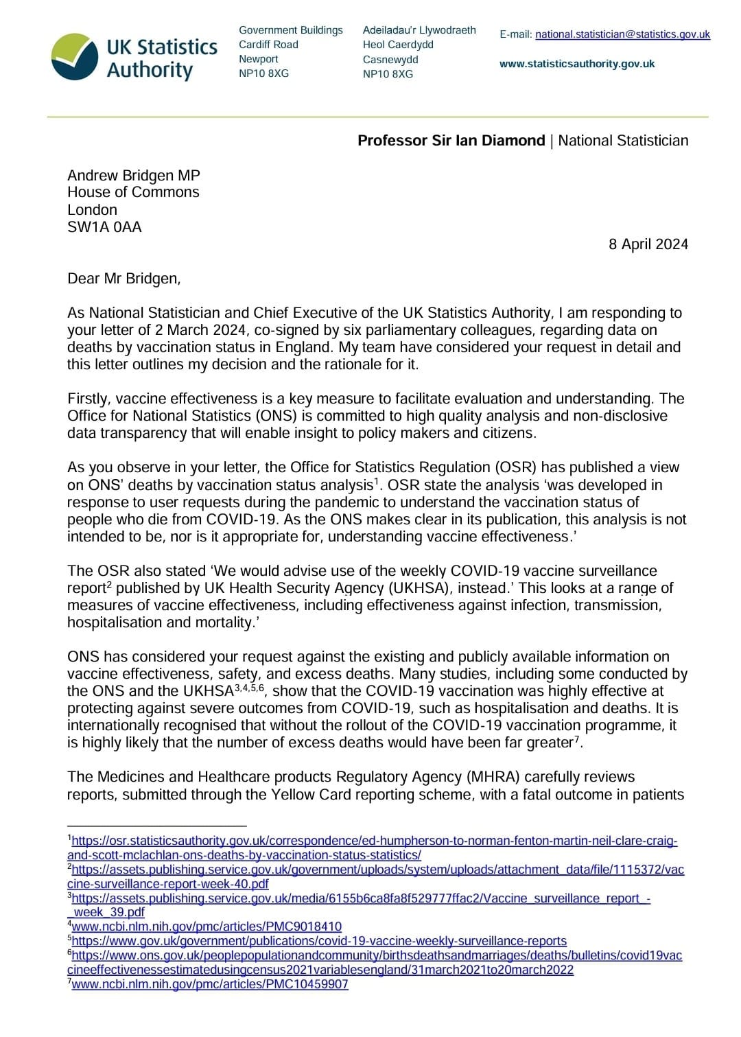 The head of the UK ONS wrote a letter in response to a request from 7 members of Parliament saying that the vaccines are safe and they have better things to do with their time than run a report that would have taken them less than 1 hour of effort to do.