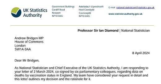The head of the UK ONS wrote a letter in response to a request from 7 members of Parliament saying that the vaccines are safe and they have better things to do with their time than run a report that would have taken them less than 1 hour of effort to do.