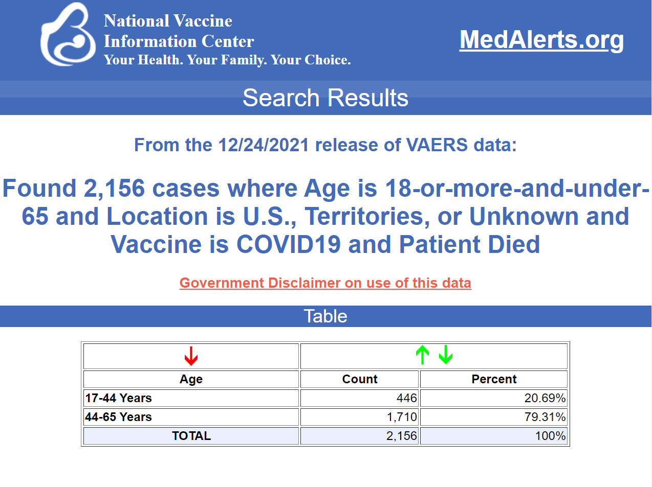Let’s see if this might match the number killed by the vaccines in the US for the same age range. I used 65 in the query because that means “under 65”: