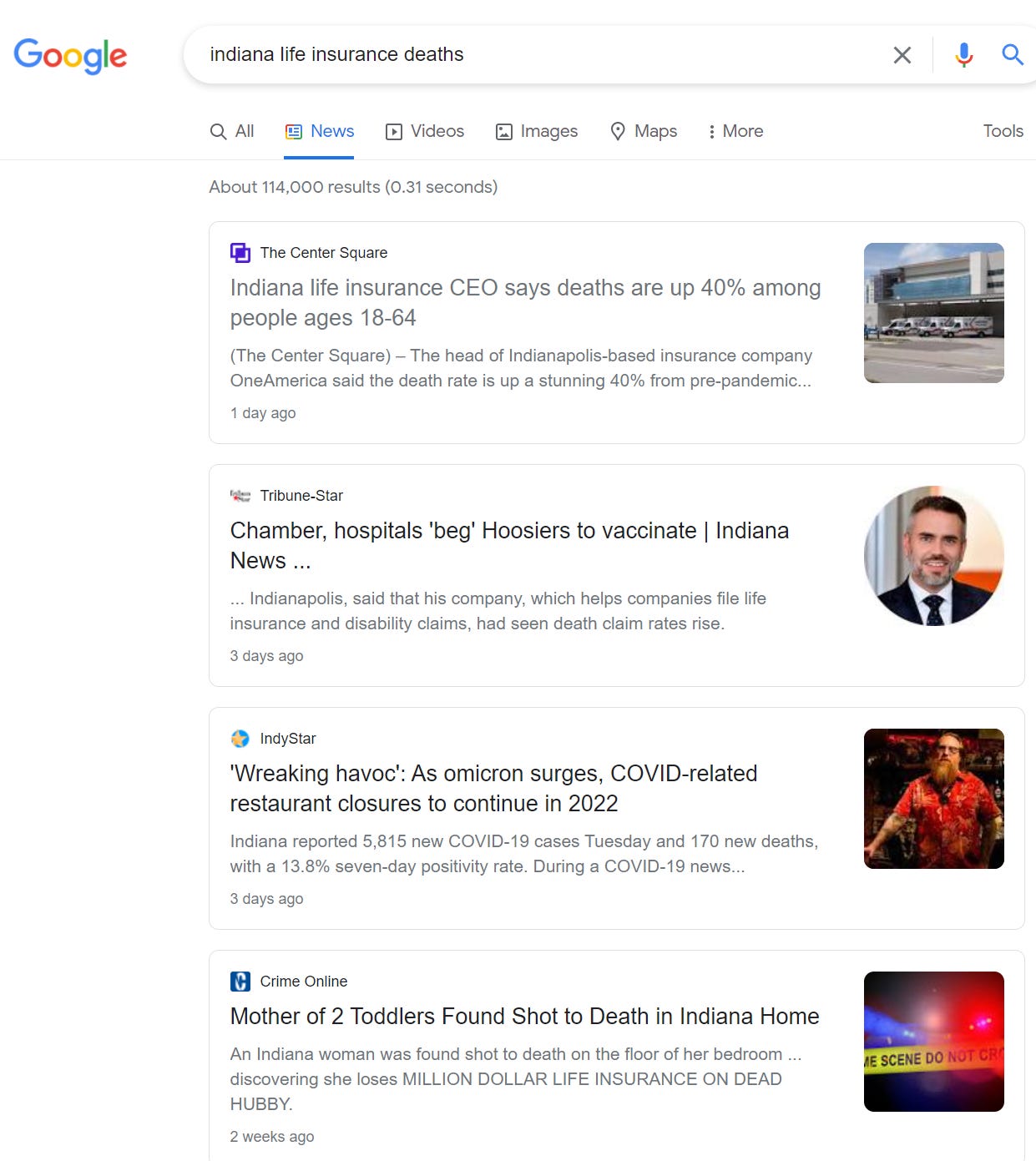 In Phoenix, the death rate of city employees (14,000 employees) in 2021 doubled from the 10-year average. That’s not a 40% increase. That’s a 100% increase. There is clearly something going on that is not unique to Indiana.