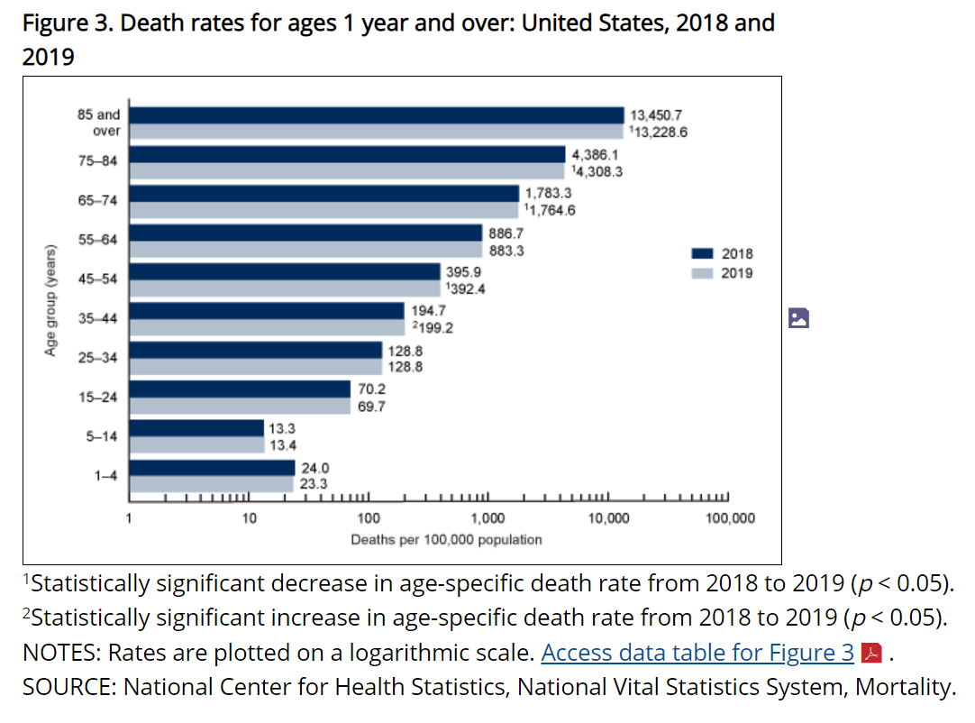 Here is the death rate by age from the CDC below. See how stable it is from year to year? Amazingly stable! So when you get a 40% jump, that is unbelievable. It is a 4-alarm fire.