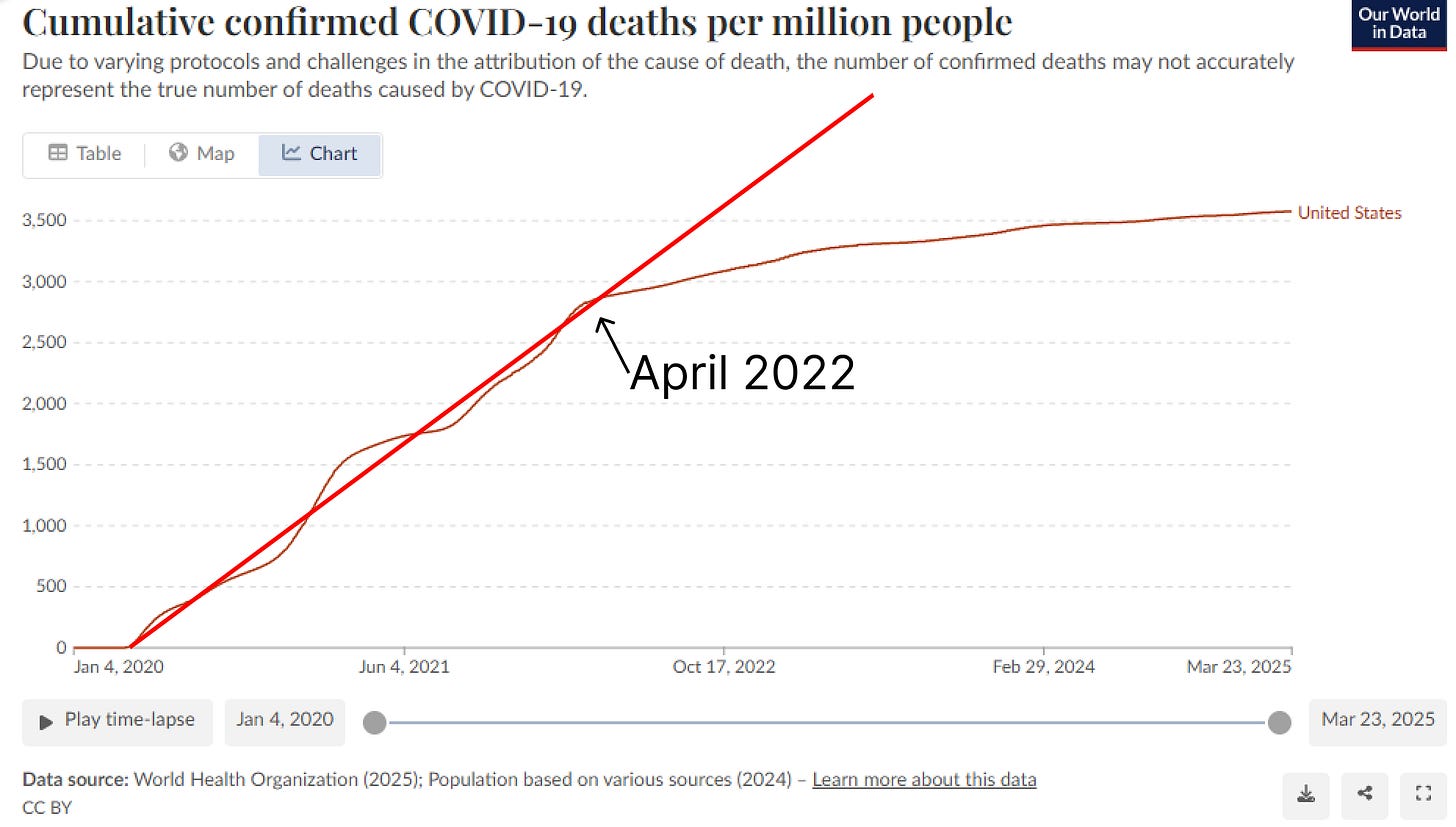 Finally, the absence of a single credible study showing a COVID death benefit for the vaccinated is stunning. And so is the lack of a “knee” in the cumulative COVID deaths curve. That’s the obvious “tell” in plain sight. It’s the elephant in the room that nobody notices.