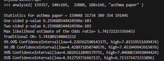 The p-value is 6e-103 and the CI intervals are tight around the odds ratio OR of 5.75.