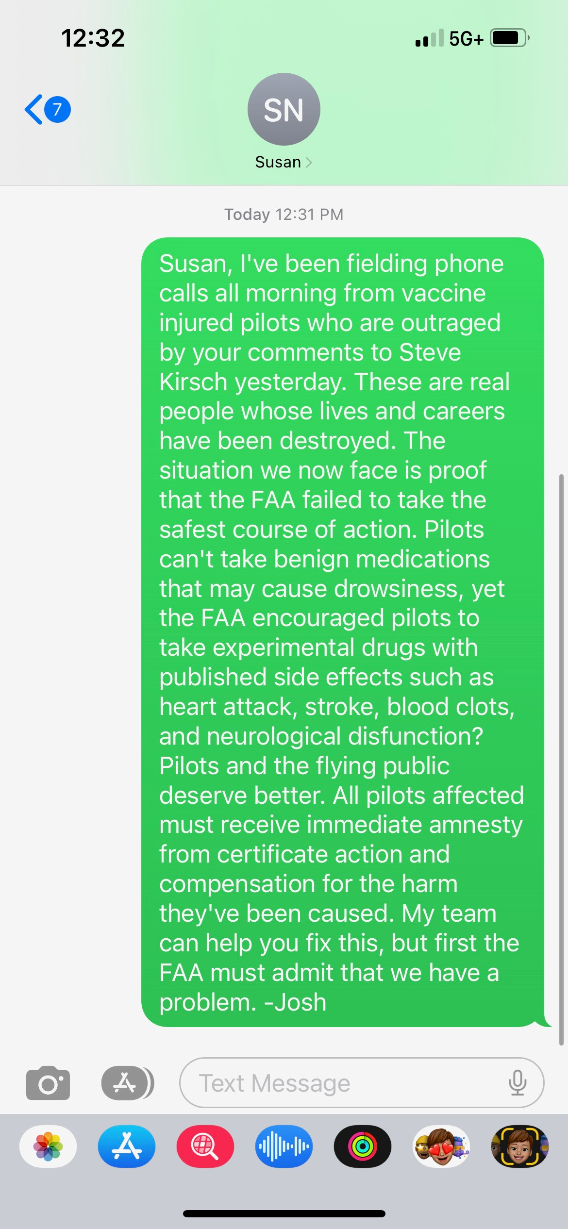 Finally, and most importantly, when put to the test, she FAILED big time. She had an opportunity this weekend to call all the injured pilots (and the wife of a dead pilot), talk to doctors like Peter McCullough who have been trying to alert the FAA of the dangers, learn that she made a mistake, and then immediately correct her error. Instead she did none of that. She didn’t even talk to a single pilot. Perhaps she was on the phone with criminal defense lawyers figuring out how to best protect herself from liability. She has her priorities in the wrong place for someone in her position. Her bosses at the FAA should request her phone records from her and see exactly how she spent her time on January 21 and 22 after my call to her. I can guarantee you it wasn’t talking to any injured pilots.