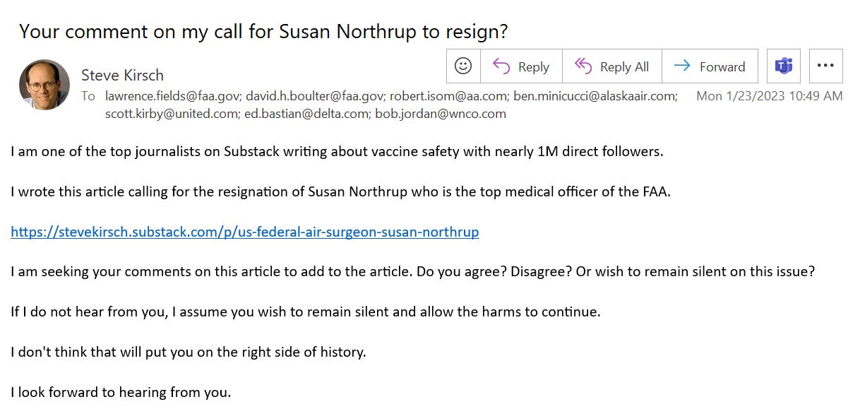 Susan Northrup needs to be immediately replaced by an executive who will put the safety of the pilots, the public, and FAA employees first and not be afraid to investigate and expose the truth about the safety and efficacy of the COVID vaccines.