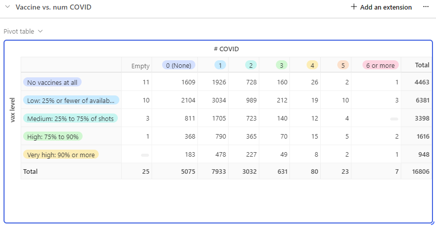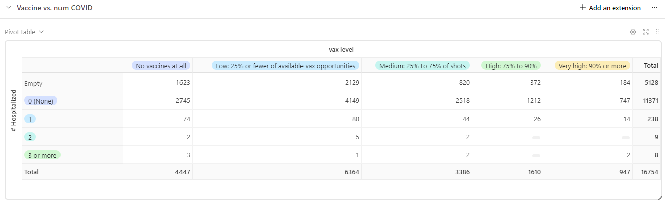 Let’s compare the “No vaccines at all” vs. the “High” and “Very high” groups. If I choose just Very high, the vaccine looks even worse, so I’m trying to be as accommodating as possible.