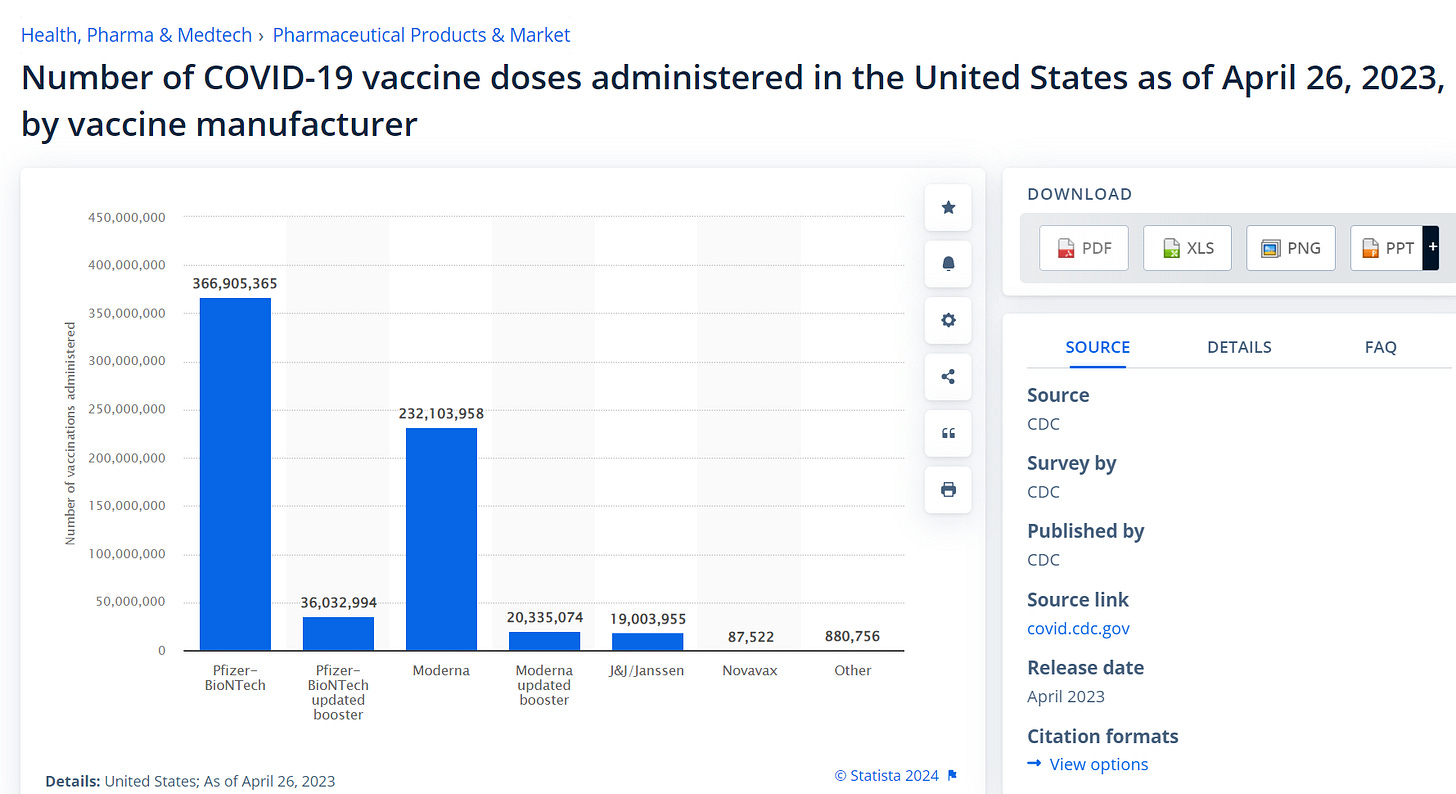 As part of the research for that article, I did VAERS queries that showed on a per shot basis that Moderna killed around 50% more people than Pfizer. And J&J was even worse than Moderna.