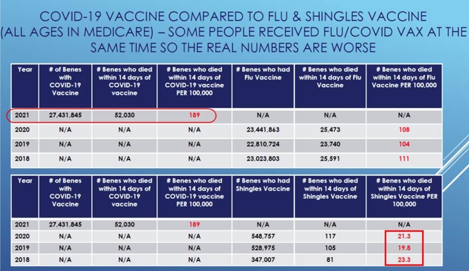 Here’s the key slide comparing 189 (covid vax) vs. 20 (shingles vax) death rate in 14 days post shot.