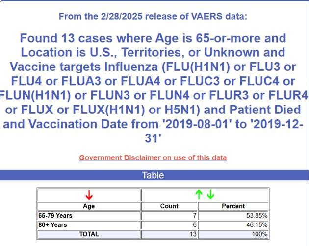 Let’s compare the VAERS death report for those who got their flu shot in 2020 vs. those who got their COVID shots on or before May 2021 for those 65 and older.