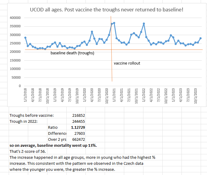 Below is the US ACM for all ages. See the 13% per year increase in baseline deaths? There were 662K baseline excess deaths available. It’s plausible that most of that is the vaccine because nobody can explain such a sudden rise.