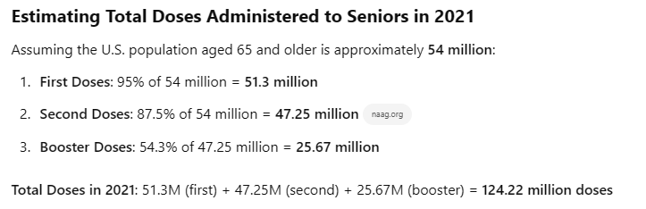 This means that Pfizer had 45*6000 deaths (reducing to allow for coincidental deaths) per 296M doses which is .9 death per 1,000 doses. For Moderna, it’s 40% higher at 1.2 deaths per 1,000 doses.