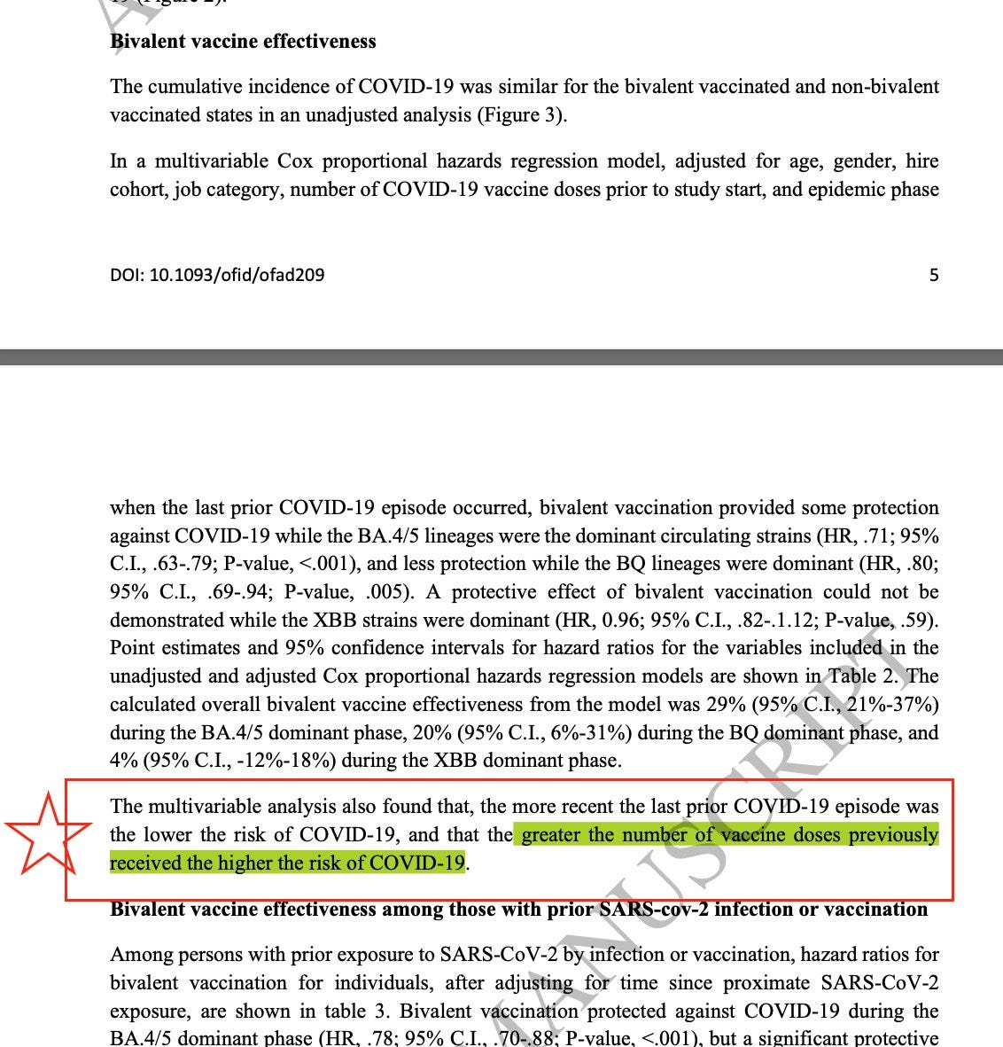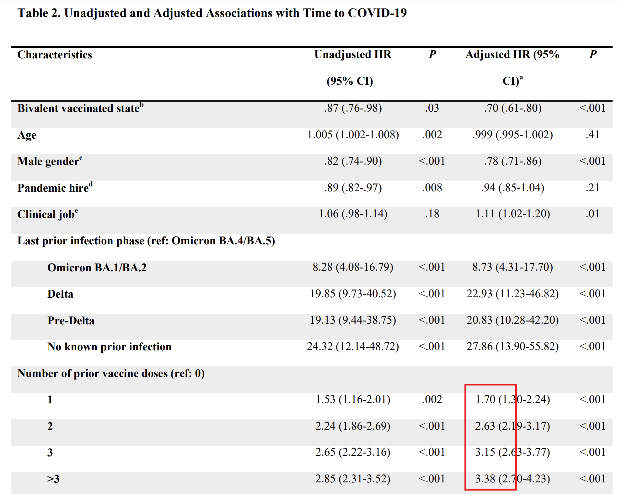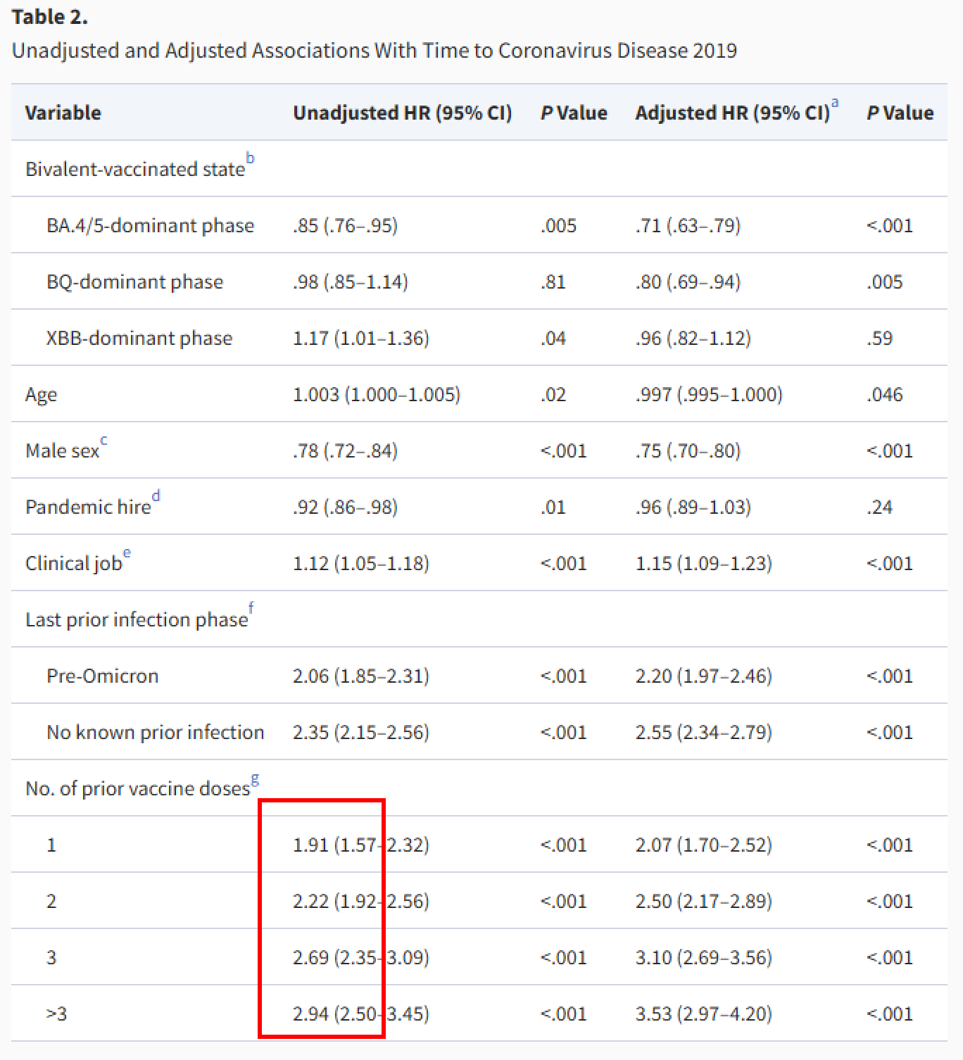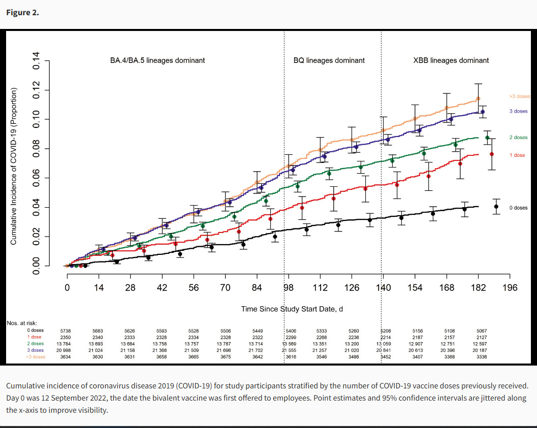 “Compared to 0 or 1 prior vaccine doses, risk of COVID-19 was incrementally higher with 2 prior doses (HR, 1.46; 95% C.I., 1.12-1.90; P < .005), 3 prior doses (HR, 1.95; 95% C.I., 1.51-2.52; P < .001), and more than 3 prior doses (HR, 2.51; 95% C.I., 1.91-3.31; P < .001)” which was very close to their original finding on an earlier variant.