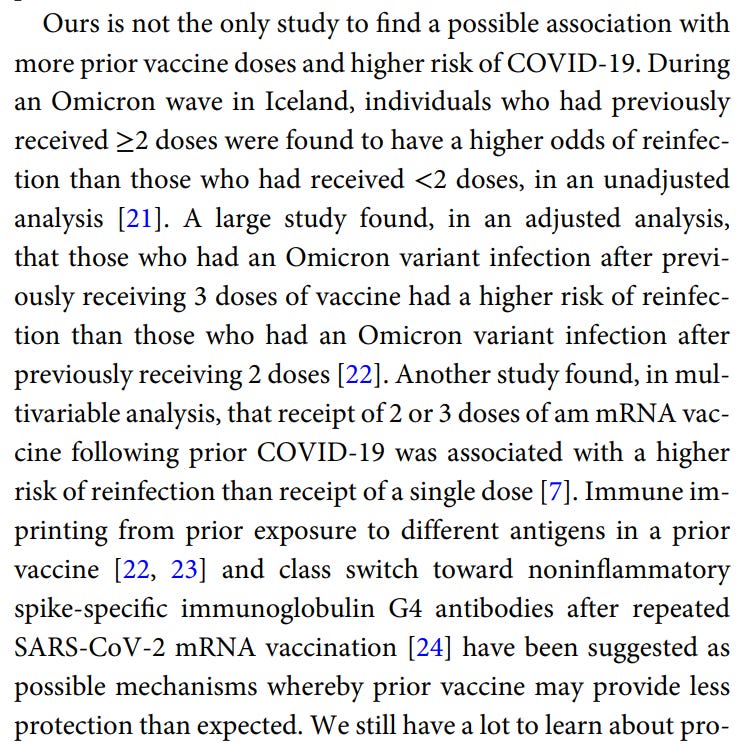 And the kicker was they said that they were not the only study to find this effect where the more vaccines you got, the greater the risk of getting COVID. They cited two other papers which found the same thing. They concluded that there is a big problem here: “it is important to examine whether multiple vaccine doses given over time may not be having the beneficial effect that is generally assumed.”