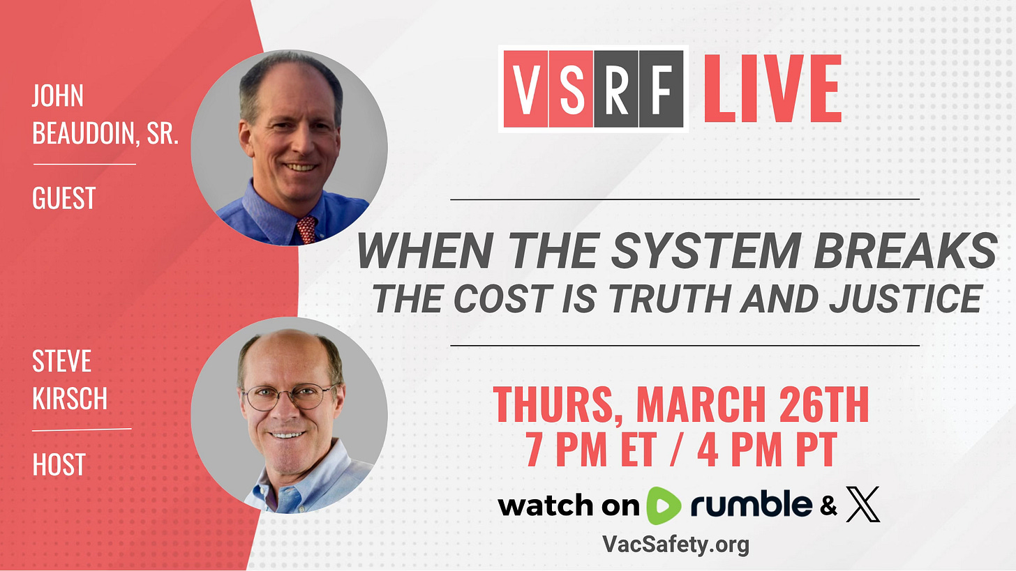 Tonight on VSRF Live, we’re joined by our good friend, John Beaudoin, Sr. John is an engineer, independent researcher, and author of The Real CDC. If you’ve followed his work, you know he goes where others won’t: straight into the data.