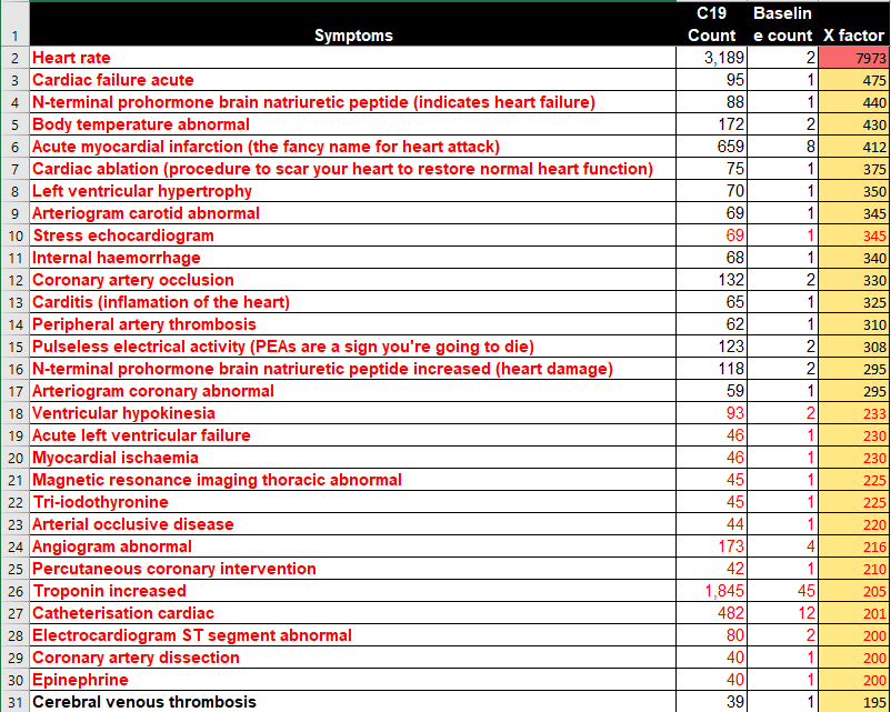 Here are a list of just the cardiac symptoms alone that are elevated by 200X normal or more.