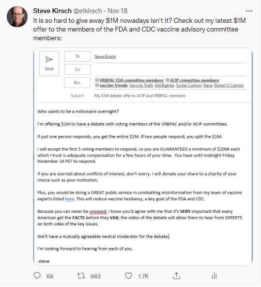 I find it telling that nobody who is a prominent proponent of vaccination is willing to sit down and have a recorded discussion with my team of experts. As shown below, I even offered them a million dollars to come have a discussion with us and nobody was interested.