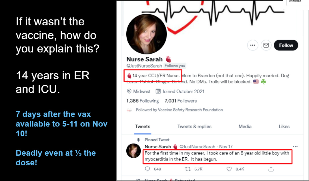 I saw this Tweet from one of my followers. First time in her 14 year career she has ever seen an 8 year old child with myocarditis. Welcome to the “new normal.”