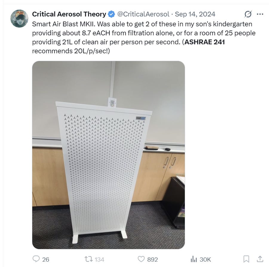 So for a modest $2,000 investment per classroom, we could have kept all the schools open during COVID while reducing risk by over 95%. It would be the equivalent of moving the classroom outdoors in still air.