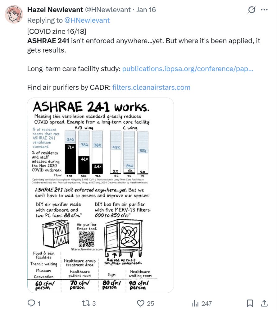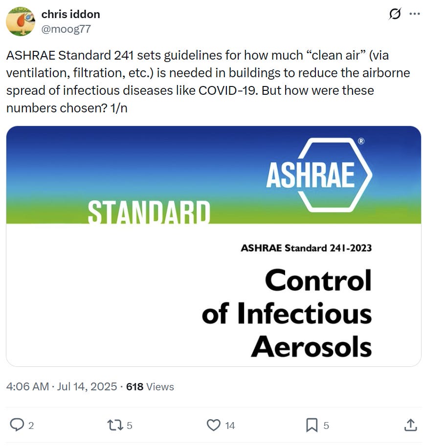 ASHRAE 241 standard (2023) now gives Congress a ready template, an industry standard to use. Here’s the fact sheet (PDF) and the home page. The U.S. White House COVID Response Coordinator, Dr. Ashish Jha, remarked that Standard 241 “is one of the most important public health interventions I have seen in years, if not decades. It is really heartening to see this organization take a central role in tackling the biggest challenges facing human health in the U.S. and around the world.”