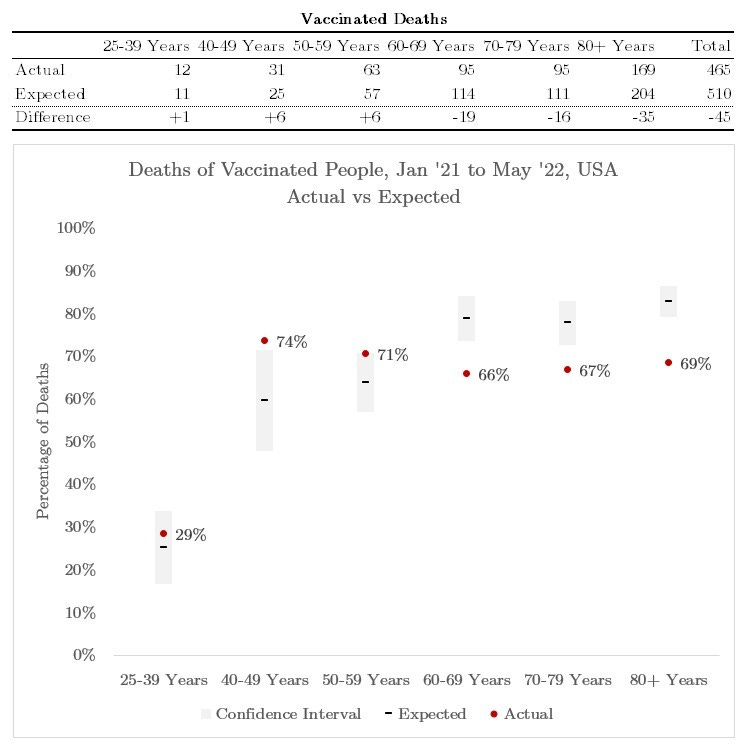 Figure 1 represents the percentage of deaths between Jan '21 and May '22 that were of vaccinated people of different age groups compared to the expected percentage of deaths.