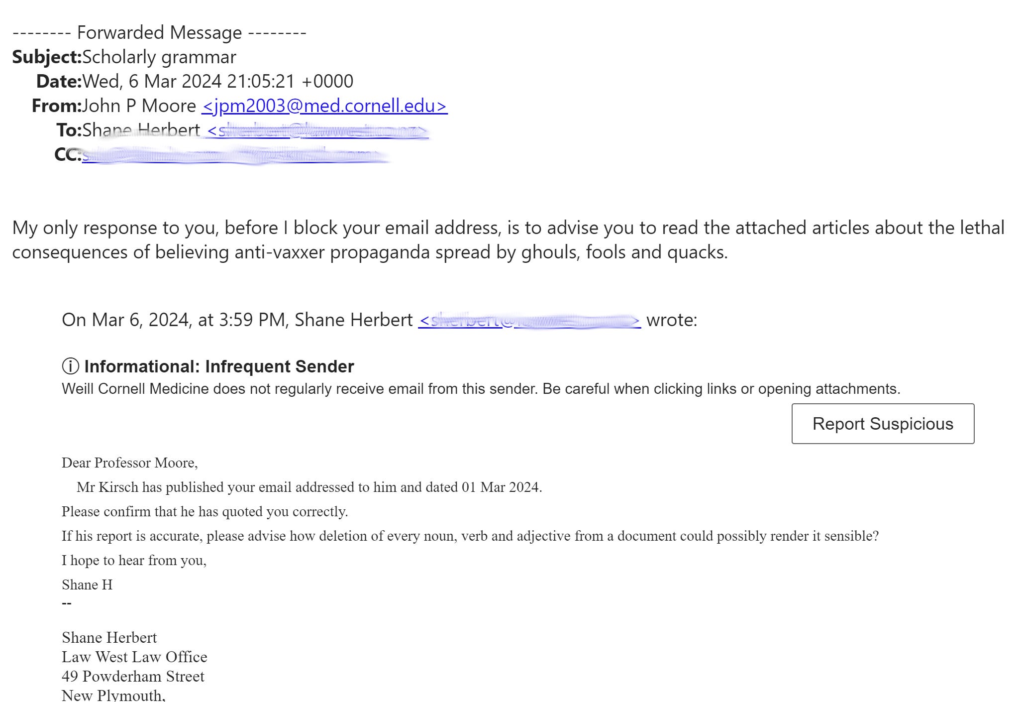 A New Zealand lawyer asked for clarification Professor Moore’s email: