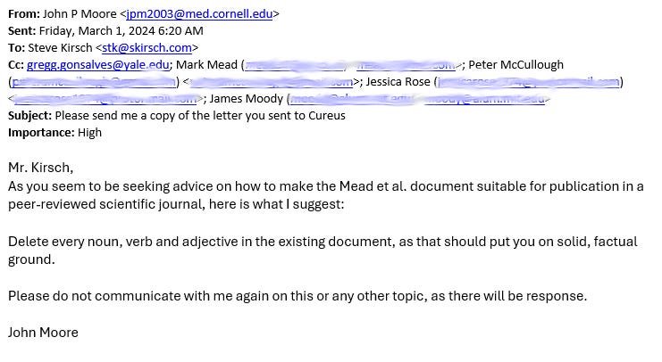 I wrote to Professor John Moore directly who also refused to provide the letter that the Retraction Watch published. Instead, he wrote this